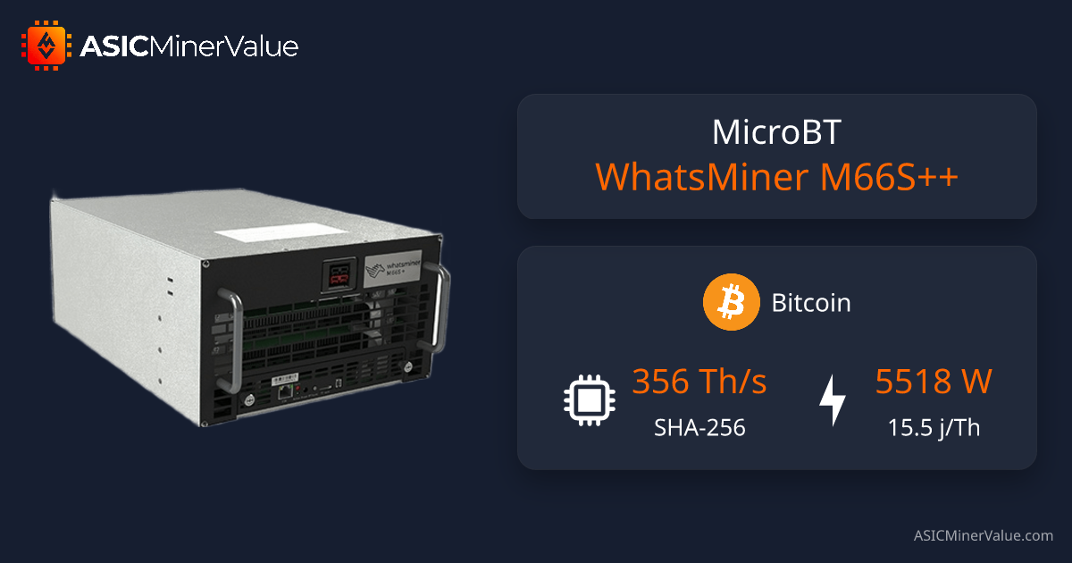 The MicroBT WhatsMiner M66S++ is a high-performance ASIC miner released in December 2024, engineered for SHA‑256 algorithm mining (Bitcoin, BCH, BSV, etc.). It delivers an impressive 356 TH/s hashrate with a power draw of approximately 5,518 W—yielding an energy efficiency of ~15.5 J/TH reddit.com+15microbtwhatsminer.net+15whatsminermicrobt.com+15.